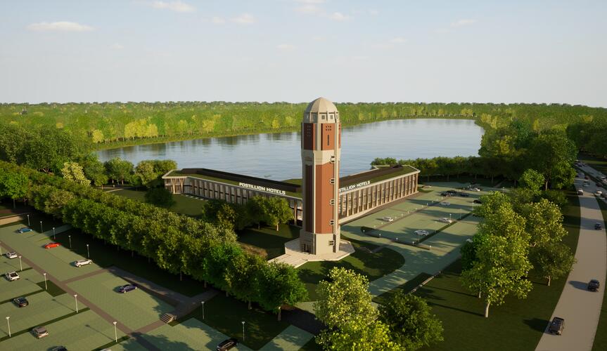 De uitbouw aan de toren gaat eraf, hij komt weer los te staan. De 340 parkeerplaatsen liggen verdiept. ,,De toren komt weer op een voetstuk te staan”, lacht Polak, ,,hij keert in oude glorie terug.” Dat is te zien bij de geplande opening van wat gaat heten Postillion Hotel Breda Biesbosch op 1 april 2026.